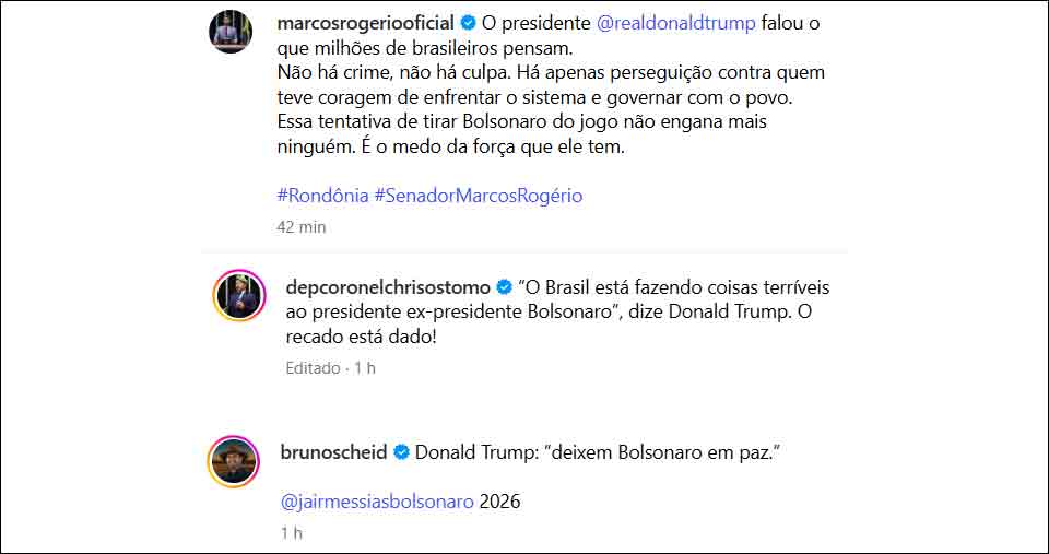 “O presidente @realdonaldtrump falou o que milhões de brasileiros pensam. Não há crime, não há culpa. Há apenas perseguição contra quem teve coragem de enfrentar o sistema e governar com o povo. Essa tentativa de tirar Bolsonaro do jogo não engana mais ninguém. É o medo da força que ele tem.”
